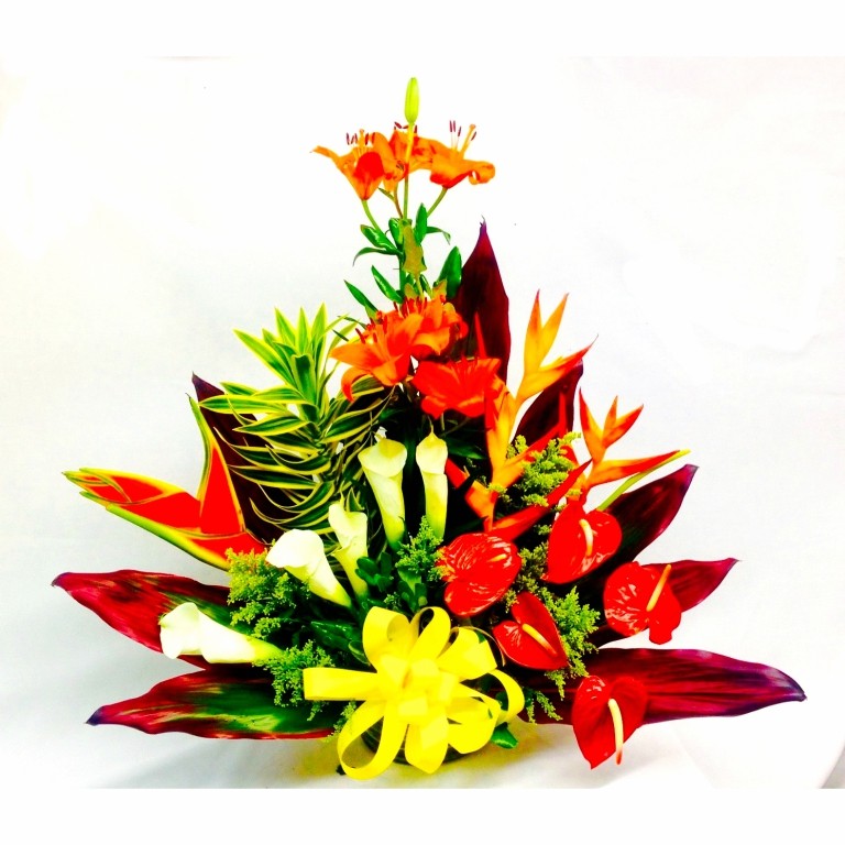 Detalles: Flores exóticas, flores complementarias, follaje, moño.